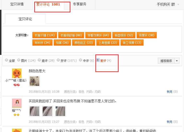 其次就是他的收藏人气,第二款宝贝收藏有5万,但第一款只有1万,对于我们一个爆款来说,收藏意味着潜在客户,特别是女装这一块。大部分的买家,都有先收藏后购买的习惯,所以说收藏人气是我们的一个重要的评判标准。最后我们来看一下差评这一块,这款宝贝有四个差评,一般宝贝有九个差评,但是因为他们累计评论的一个数量之间有差距,虽说最终算下来,实际上这个产品没有太大的一个差异化,那么中差评,就这两款宝贝来说,我们可以忽略。